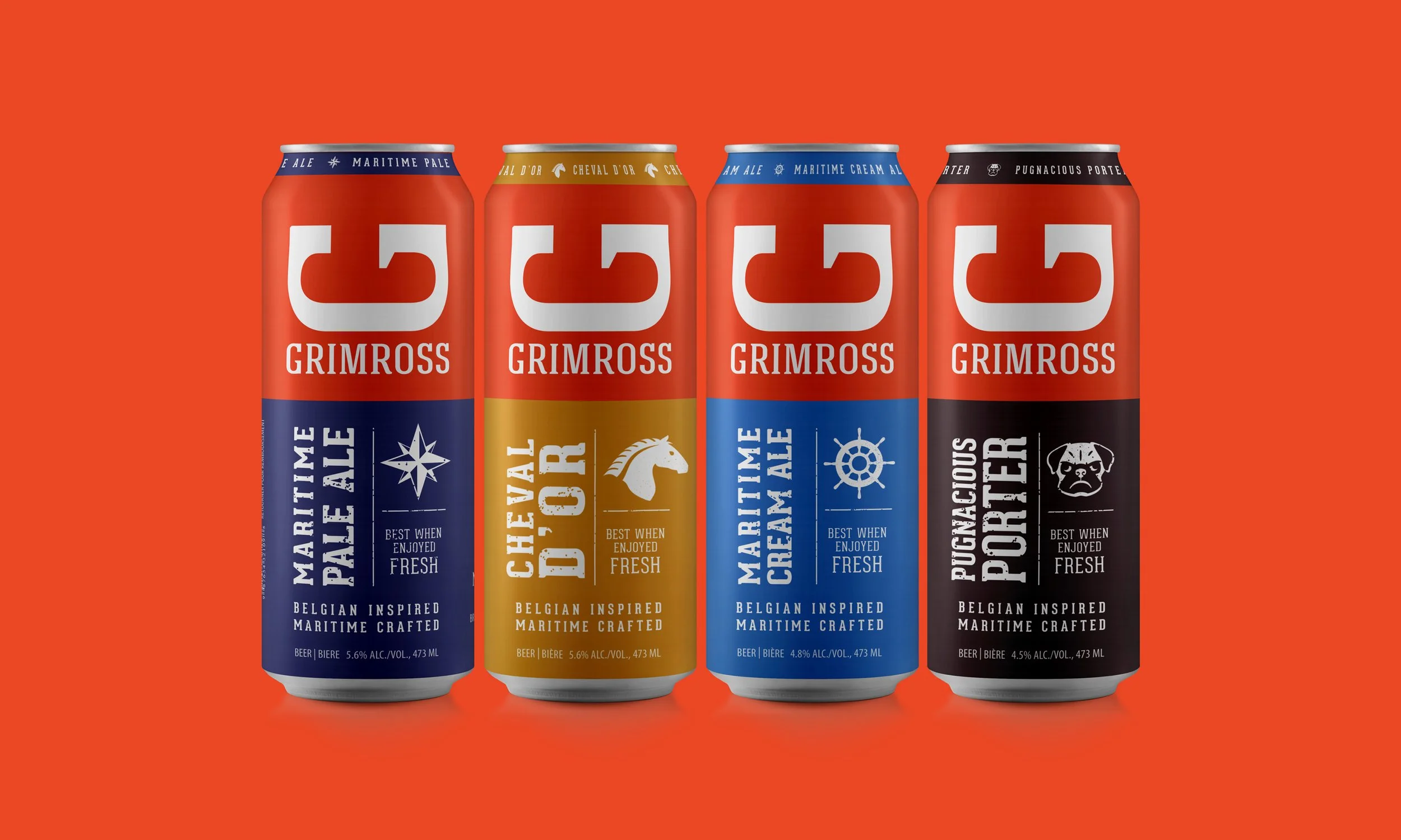 Back in 2018, the craft beer market was starting to explode in Canada. From a packaging perspective, many if not most brands were trying to stand out against traditional beer labels by producing outrageous one-off can designs. The Belgian-inspired and Fredericton-based brewery Grimross took a different route with a page out of classic CPG packaging design theory. Products need to be distinct from each other, but the “master” brand needs to be consistent. The result on shelf is a powerful block of colour and branding that draws people in, and the sub-brand colours and graphics help them make a quick choice.